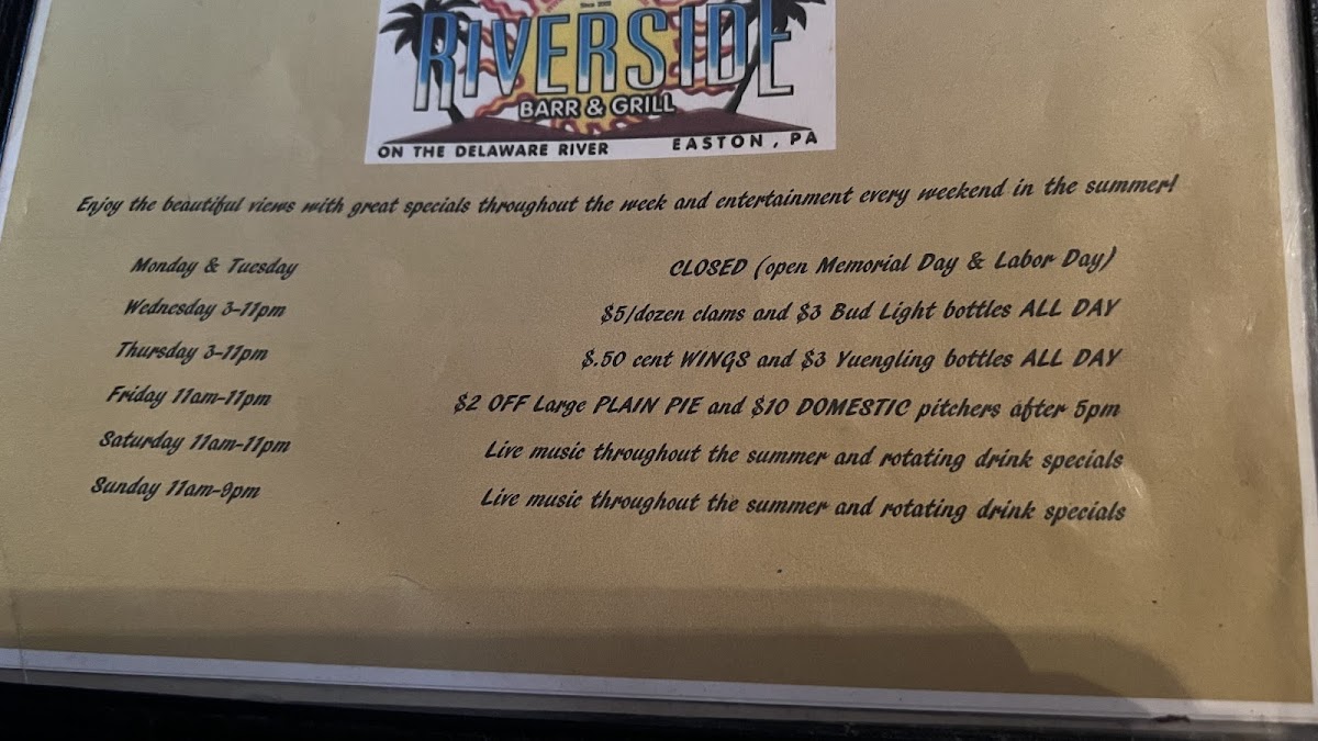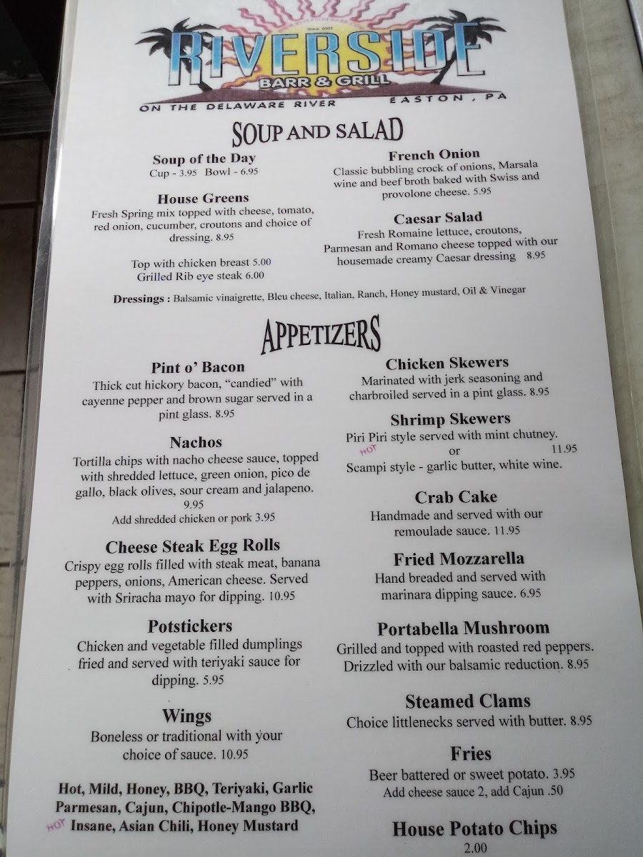 Welcome to Riverside Barr and Grill, where the scenic beauty of Easton, PA, meets a delectable menu brimming with flavor. Located on the banks of the river, this hotspot invites you to indulge in an array of mouthwatering dishes. Start your culinary journey with tempting appetizers such as Pint O' Bacon and Crab Cakes, perfect for sharing or savoring solo.